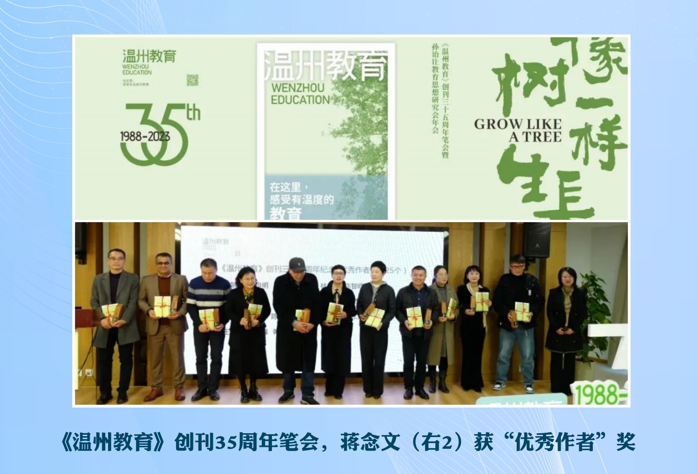 时间:2024-01-09 15:21:07 浏览:1659《温州教育》创刊三十五周年笔会暨孙诒让教育思想研究会年会在温州市图书馆四楼品读区举行,蒋念文老师受邀参加活动,获“优秀作者”奖。...