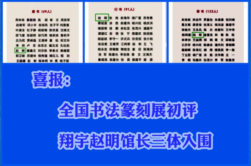 全国书法展初评,翔宇赵馆长隶行草三体入围