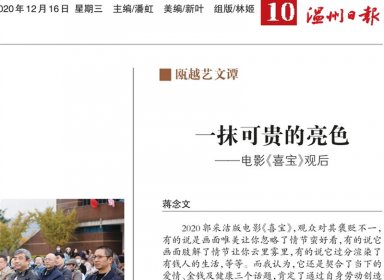 时间:2020-12-16 15:40:48 浏览:10952020年12月16日,《温州日报》文化周刊刊登翔宇中学新闻中心蒋念文老师撰写的影评文章《一抹可贵的亮色》,全文1872字。他认为:2020郭采洁版影片《喜宝》影片给了观众可贵的亮色。电影肯定了通过自身劳动创造美好生活的积极人生态度,批判了炫富与羡富两种...