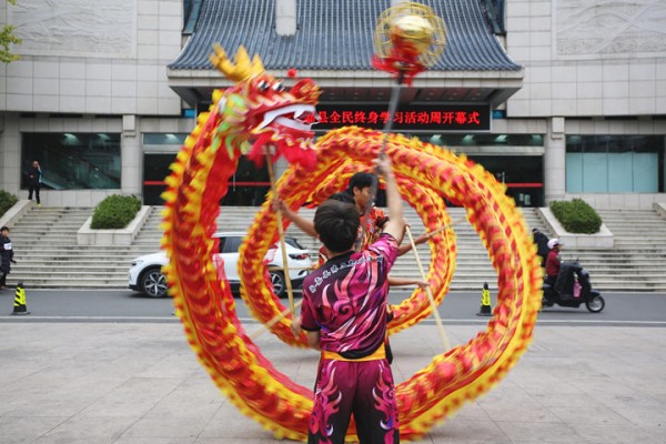 与此同时,另一部分志愿者则坚守在会议签到区,她们凭借专业的训练和严谨的态度,认真核对每一位参会者的信息,确保签到过程高效准确。她们的细致工作为活动的顺利进行提供了有力保障。在开幕式暖场环节,来自永嘉县第二职业学校的舞龙社团为社区居民带来了精彩的舞龙公益表演。栩栩如生的巨龙翻腾起舞,气势磅礴,赢得了现场观众的阵阵掌声。这场表演不仅展示了学生们的才艺,更传播了中华优秀传统文化的独特魅力,激发了社区居民对传统文化的热爱与传承意识。