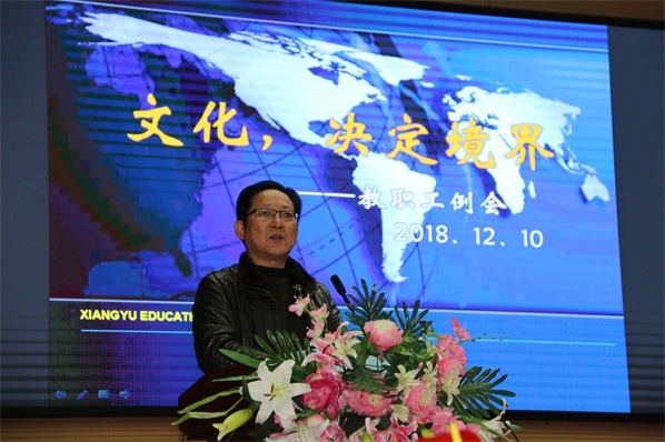 最后朱校长以《文化,决定境界》为题做了讲话。他为老师们阐述了文化在学校管理中的意义。文化是桥梁和纽带,它将使我们每一个人: 思想息息相通,情感紧紧相连,知识相互补充,行为相互协调。他希望老师们都能够在管理工作中遵循以人为本、与人为善、对人负责、助人成功的原则;在教育工作中做到 目中有人、充分尊重 、无限相信。