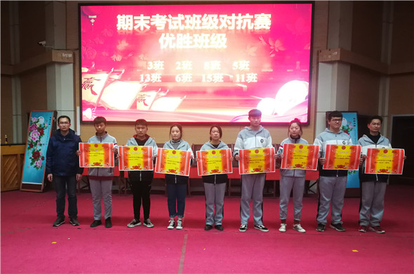 会议首先对在期末考试中对抗胜利的班级颁发“优胜班级”奖。韩主任在对这些优秀班级的颁奖词中赞美到:“如果说,自信是一种魅力,他们的魅力正感染众生;如果说,荣誉是一道光环,他们的光环正熠熠生辉; 共同努力,共同前进,他们不仅仅是一个班集体,还是一个温暖的家。 ”