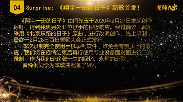 大会进行第四项,最激动人心的时刻:《翔宇一班的日子》班歌首发。歌曲由闫先玉等同学作词,王一平同学任音乐总监,十二位同学演唱,歌词内容均是同学有感而发,同学们多被感动落泪。