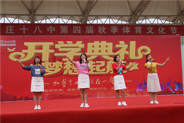 2020年9月1日,枣庄市第十八中学全体师生在学校运动场隆重集会,举行“梦想起航”金秋开学典礼。山亭区政府党组成员、枣庄十八中党委书记张成国,山亭区政协党组成员、枣庄十八中校长褚红丽,翔宇教育集团常务副总校长高立顺,十八中副校长龙斌、李保德、袁作林,校长助理满友华、甘宜顶及家长代表闫绍付于主席台就坐,枣庄十八中全体师生及部分家长代表参加典礼。大会由副校长袁作林及牛先旺、程红莹同学主持。