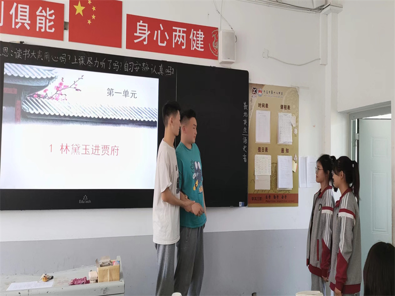 杜文倩老师组织并指导班级学生在语文课上表演精彩片段:《黛玉进贾府》。安排了贾母,王熙凤,林黛玉,贾宝玉四个角色,学生根据人物的性格和地位现场演绎,彼此配合默契,表演的惟妙惟肖,准确把握人物的心理,全场掌声跌宕起伏。杜老师称赞:“个个都是戏精”。通过这次表演,学生能更深刻的把握人物特征,进一步理解《红楼梦》。