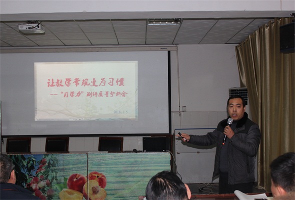 接着, 郑秀共副校长在分析会上作了“让教学常规成为习惯”为主题的“月学力”测评质量分析报告。首先,郑校长以“2018以学习的姿态进入状态,最好的成长是分享”引入,然后从“常规的定义及内涵”“习惯的力量”“ 落实常规”“理想课堂”“教师六不讲”“考后反思及行动”等方面系统细致地阐述了常规工作的重要意义。郑校长结合目前教育教学存在的问题提出了改进的措施,对近期的各备课组和各年级的教学工作做了统筹安排。最后,他希望全体教师客观正确的看待本次检测成绩,认真查摆不足,积极总结经验,全面备战期末检测,做到“经一事长一智”, 不断进步提高。