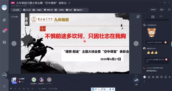 疫情且尽学未断,繁春正当志更扬。2020年4月17日下午,枣庄翔宇中学九年级在云平台上举行了 “理想·前途”主题大班会暨“空中课堂”表彰会。副校长陈家旺、孙亮亮,级部主任齐继磊与管委员成员连吉伟、李玉峰、孙海深,全体班主任,近1400名九年级学生及家长参加了大会。会议由魏徽主任主持。
