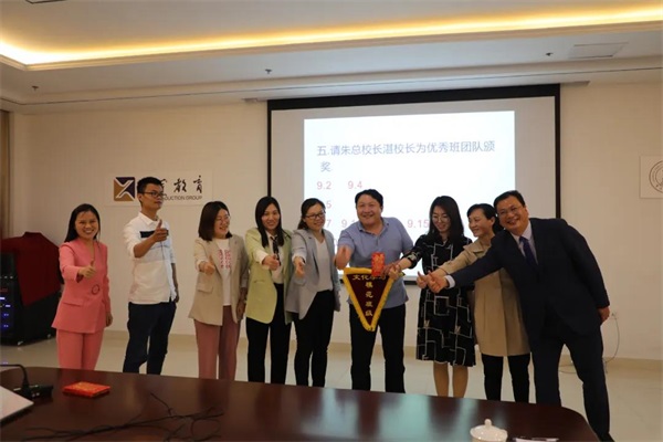备课组长发言结束后,级部对成绩突出的备课组和班级进行了表彰。九年级语文组、英语组、历史组被评为“优秀备课组”,10个班级被评为“优秀班团队”。校长朱建文、执行校长湛晶为每个优秀团队颁奖并合影留念。大家一起喊出了自己团队的口号,并纷纷上演“领奖秀”,或比心,或叠手……气氛高昂热烈,溢满团结奋进的力量。
