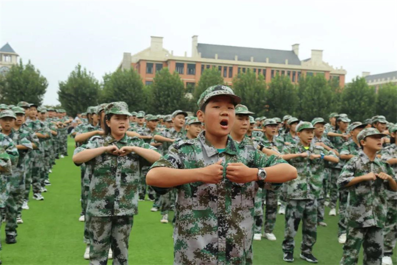 身着迷彩服、脚踏彩虹道,在学长学姐们热烈的掌声,在全体教师的陪伴下,七年级的新生们洋溢着灿烂的笑容、呼喊着嘹亮的口号、踏着整齐的步伐进入运动场。