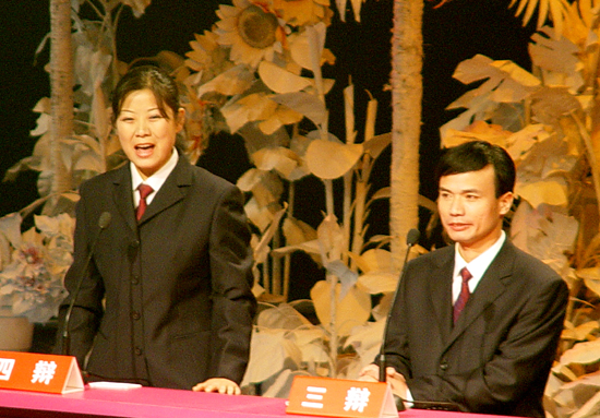 开场陈词的各不相让,推动了整场比赛的气氛。在第三回合自由辩论中,队员的唇枪舌战更是让赛场上硝烟弥漫。正方陈述说:“现代化是什么?现代化不是386,现代化是奔四,奔五甚至奔六啊”。反方立刻回敬:“现代化是什么?现代化是人的现代化啊,对方辩友如果把一个古代的人拉到现代的高楼大厦下面来,难道他也现代化了吗?”正方立刻表示:“难道你穿着破烂的衣服食不果腹,对人说,我有现代化的思想啊,难道这就是现代化了吗?”……选手们如滔滔江水般喷涌而出的精彩辩词,不断撞击出闪亮的“火花”。