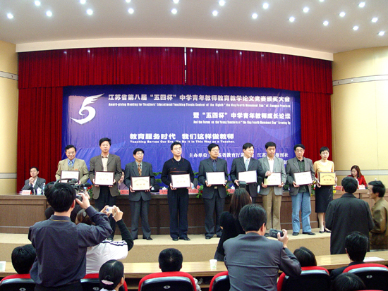 5月15日至16日,江苏教育厅基教处、江苏教育报刊社主办,翔宇承办的江苏省第八届“五四杯”青年教师教育教学论文颁奖大会系列活动,在宝应中学举行。全省500余名获奖老师及专家、学者与会。两天的会议精彩纷呈,知名学者肖川博士和翔宇总校长卢志文应邀做精彩学术报告,清华附中韩军老师和两位获奖作者(翔宇张广银、张家港邬建芳)开设同题观摩课,全国中语会秘书长顾之川现场点评。在5月15日晚间举行的首届“五四杯”青年校长论坛上,启东中学王生、南师附中王占宝等省内外7名知名校长及肖川博士、省教育厅基教处领导殷天然先后发表演讲;论坛由省委教育工委副书记葛高林揭幕。在5月16日的颁奖活动上,葛高林认为首届青年校长论坛很具前瞻性,由翔宇承办的本届盛会增加了许多新亮点。闭幕仪式上,宝应人民政府县长林正玉,扬州教育局副局长穆光曙、翔宇董事长王玉芬与主办方领导在主席台就座并发表讲话。在本届论文大赛中,翔宇教育集团有8人获一等奖,14人获二等奖,集团三所中学均获优秀组织奖。