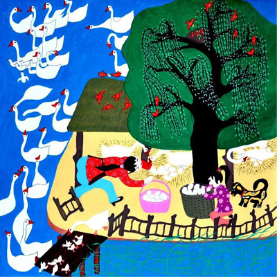 “你们是如何让农民画作者团聚在你们周围的?”“你们的农民画作者真的都是农民吗?”“这么漂亮的色彩,几十年保持鲜艳靓丽,用的什么颜料?”面对记者关于博里农民画的提问,马飞亚总经理详细介绍了博里农民画的历史,传承与发展,以及产业化路径。“我们的‘大画家’都是当地人,木匠、油漆工、养猪养鸡的庄稼汉,开超市的,开照相馆的,理发的,为了同一个梦想聚集到一起。所以我们特别注重体系内的文化建设,除却进行情怀感召、物质补偿外,着重培养大家的职业认同感,提高画作的水平,使博里农民画能真正做到拿得出手,走得出去,扬得了名!”