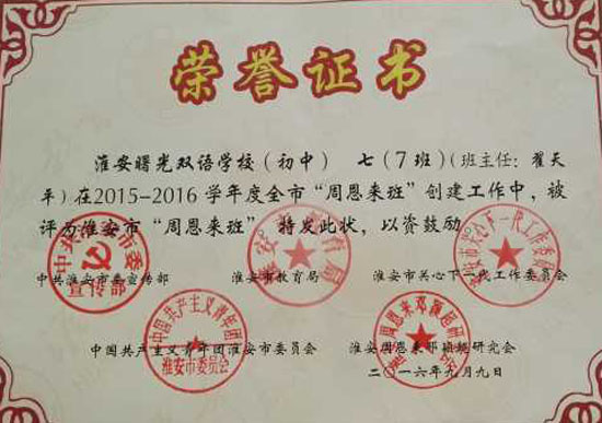 9月26日从淮安区教育局获悉,淮安曙光双语学校初中部在2015-2016年度淮安市“周恩来班”创建工作中成绩显著,被评选为“先进集体”,淮安区仅两所初中获此殊荣。与此同时,七(7)班被评选为市级“周恩来班”。