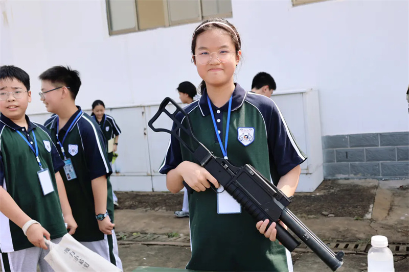 清晨的阳光洒满整洁的营区,身着校服的初中生们难掩欣喜,好奇地张望着军营环境,各式武器装备更是瞬间抓住了大家的目光。带着激动与敬仰,同学们期待着与解放军官兵的近距离交流。