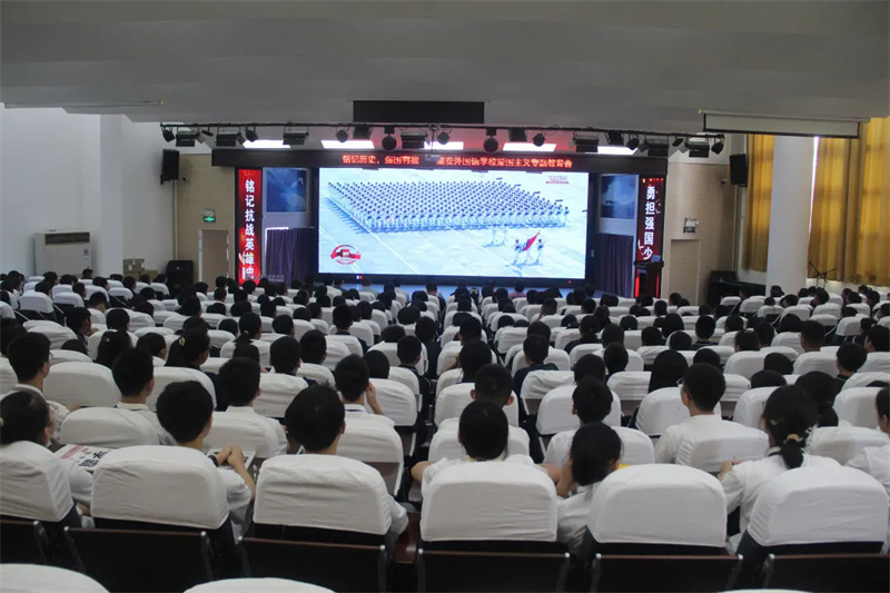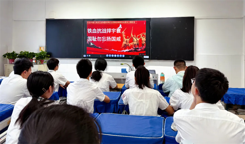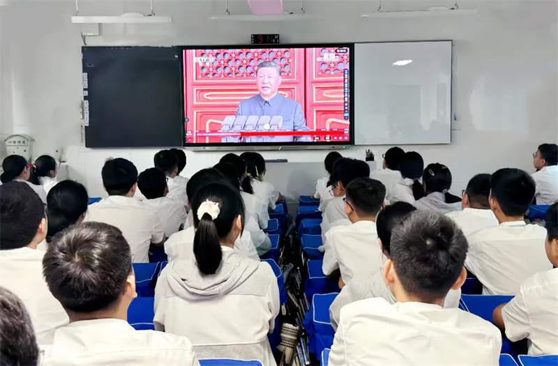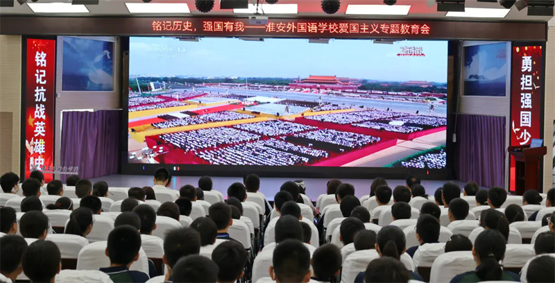 9月3日上午,淮安外国语学校全体师生集体观看了纪念中国人民抗日战争暨世界反法西斯战争胜利80周年阅兵仪式直播。校长赵树青携校务会成员、全体教师和学生代表在阶梯教室主会场集中观看,各班级在教室内同步组织观看。师生们共同见证了这场展示国家捍卫和平与发展坚定决心与强大实力的盛大仪式。