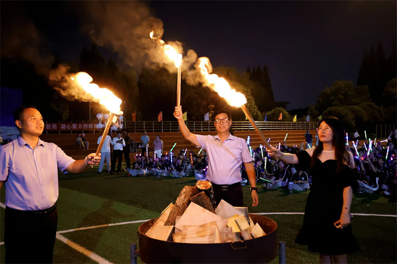 赵树青校长、王奎生副校长携手级部耿康副校长、赵国武主任以及家长与学生代表,共同点燃象征希望与团结的篝火。火光跃动,照亮每一张期待的脸庞,也拉开了晚会的精彩序幕。