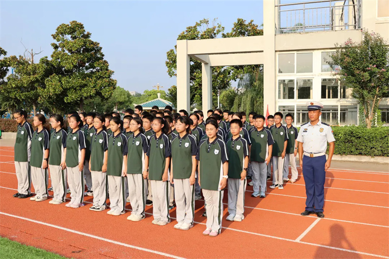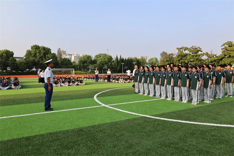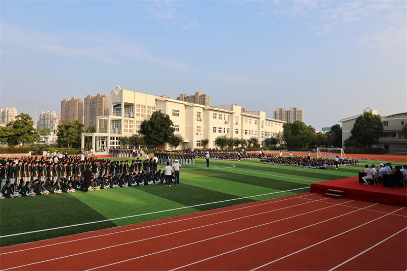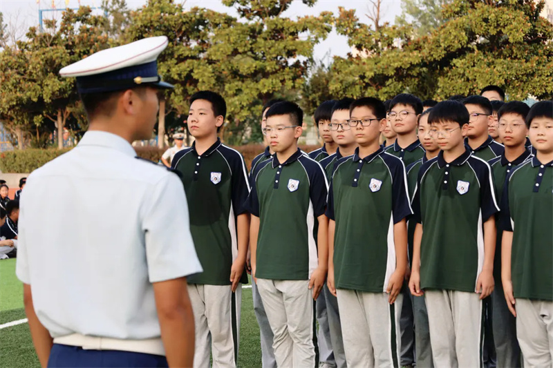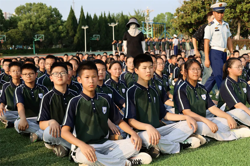 体育组顾若涵老师击鼓引领,全体新生动作整齐、呐喊铿锵,展现了五日军训的淬炼成果。赵树青校长、王奎生副校长,初一级部耿康副校长、赵国武主任,德育宣传处刘杰主任及淮安区消防大队大队长龚茂辉、翔宇救援站政治指导员周洲等嘉宾出席,共同见证这一荣耀时刻。