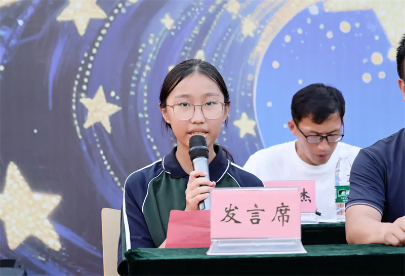 初一6班刘翊禾同学作为学员代表发言。她以“不经一番寒彻骨,哪得梅花扑鼻香”概括训练营的深刻意义,坦言军训虽艰苦,却让同学们学会了坚持、协作与超越,真正理解了“未来领袖”的责任与担当。