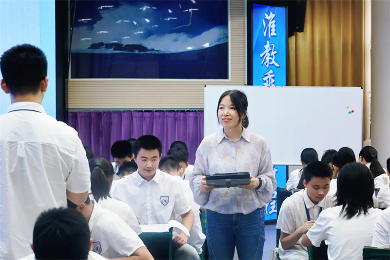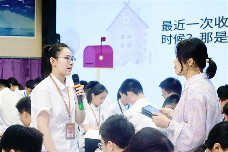 上午进行的是两节作文教学诊断课。分别由淮外宗林林和刘杰两位老师执教。宗老师授课题目是《见字如面,AI为伴》。课堂上,宗老师由学生之间撰写的祝福语谈起,借助AI修改后,再让学生进行比较阅读,让学生明白,AI仅是工具,创意才是灵魂;好作文是要有专属的回忆、动人的细节和真诚的温度。刘杰老师以《我在生活中欣赏美》为题,从教师节学生借助AI给老师设计贺卡说起,带领学生辨别AI科技手段的优劣所在,提醒学生AI只是助手,人要有真才实学。