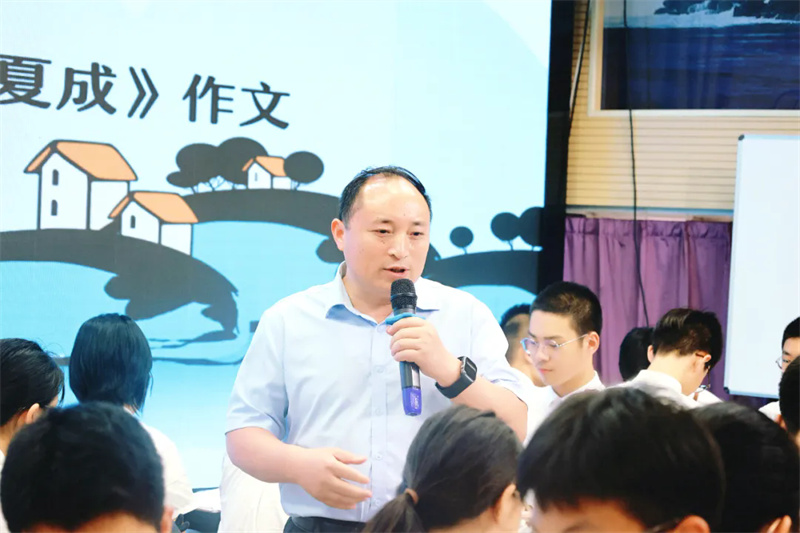 下午进行的是专家示范课。省特级教师袁海员给大家带来的是一节《春酝夏成》作文指导课。袁老师结合王芊雅同学的优秀作文,从“作文解密”、“人物解密”、“AI润色”等活动入手,层层推进,循循善诱,告诉学生AI只是工具,优秀作文还是离不开自己的真情实感。