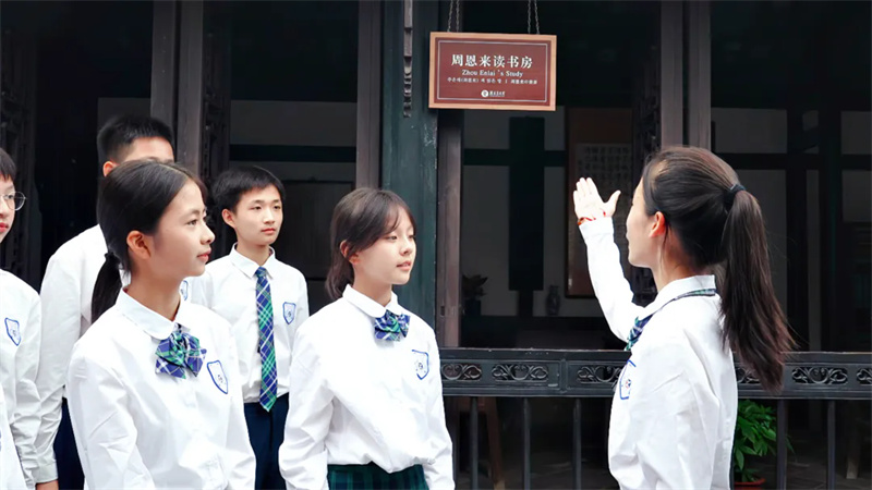 周恩来总理是淮外师生心中最耀眼的启明星和精神偶像。“以少年恩来作典范,为中华崛起而读书”,是淮外的校训,“学周”是淮外的德育特色主题。同时,淮外将思政小课堂与社会大课堂深度融合。组织师生走近多地的场馆开展行走的思政课,打造“沉浸式”学习场景,让场馆变课堂、让文物成教材,让精神成为学子奋进的动力。