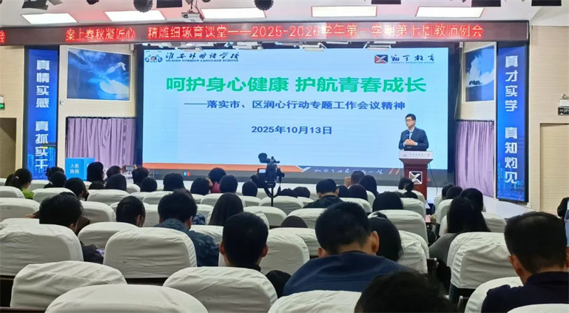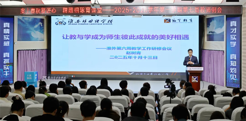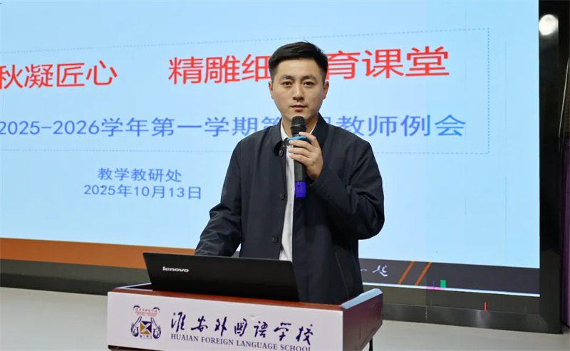 10月13日下午,淮安外国语学校在阶梯教室举行了以“案上春秋凝匠心,精雕细琢育课堂”为主题的第七周教师例会。初一、初二全体教师参加会议。会议由教学处夏文杰主任主持。