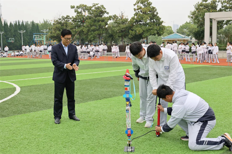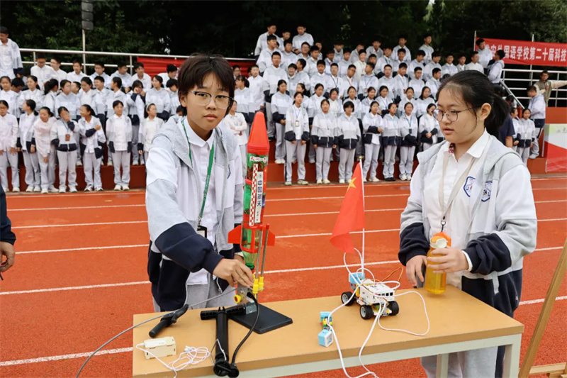 秋高气爽,青春飞扬。为激发学生的科学探索热情,全面提升实践创新能力,10月14日上午,淮安外国语学校“水火箭大赛暨科技作品现场展评”科技节专项活动在学校田径场火热上演。本次活动集趣味、创意与科学于一体,为同学们搭建了一个展示聪明才智与动手能力的广阔平台。
