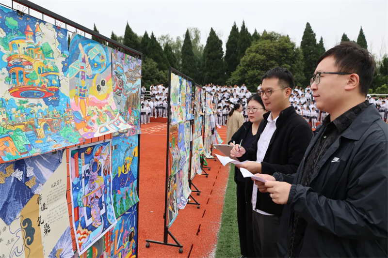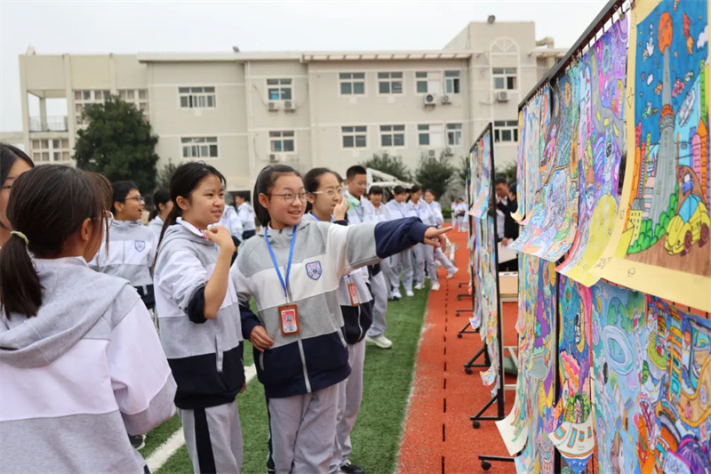 田径场的四周,是初一年级和初二年级各班级精心布置的科技作品展区。这里汇聚了同学们平日里的奇思妙想:构思精巧的科学幻想画、内容丰富的科普海报,以及各式各样充满巧思的科技小制作、小发明作品琳琅满目。