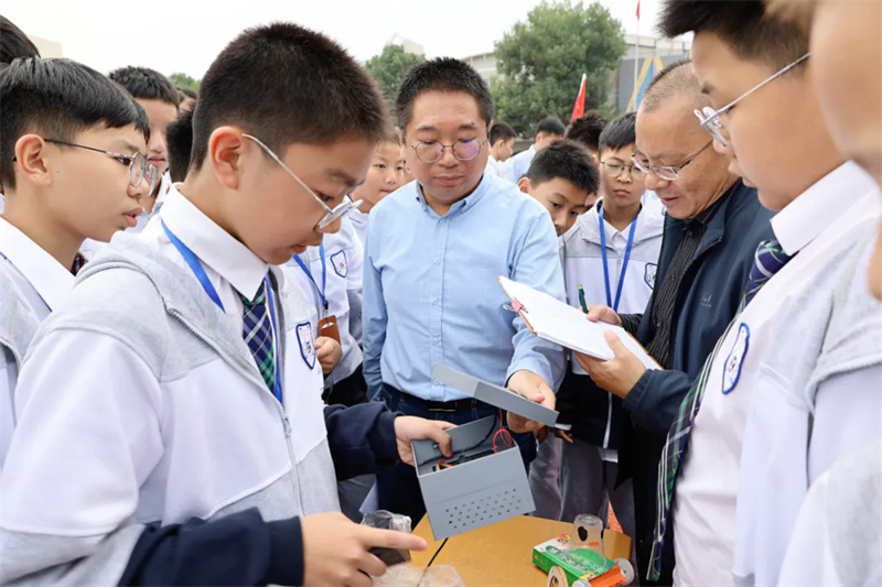 每班均安排了2名同学担任“科普讲解员”,他们自信从容地向评委老师与围观同学们介绍本班作品的创作思路、蕴含的科学原理以及独特的创新点。评委老师们穿梭于各个展位之间,认真聆听,并从专业性、创新性、完成度等多方面进行综合评分。