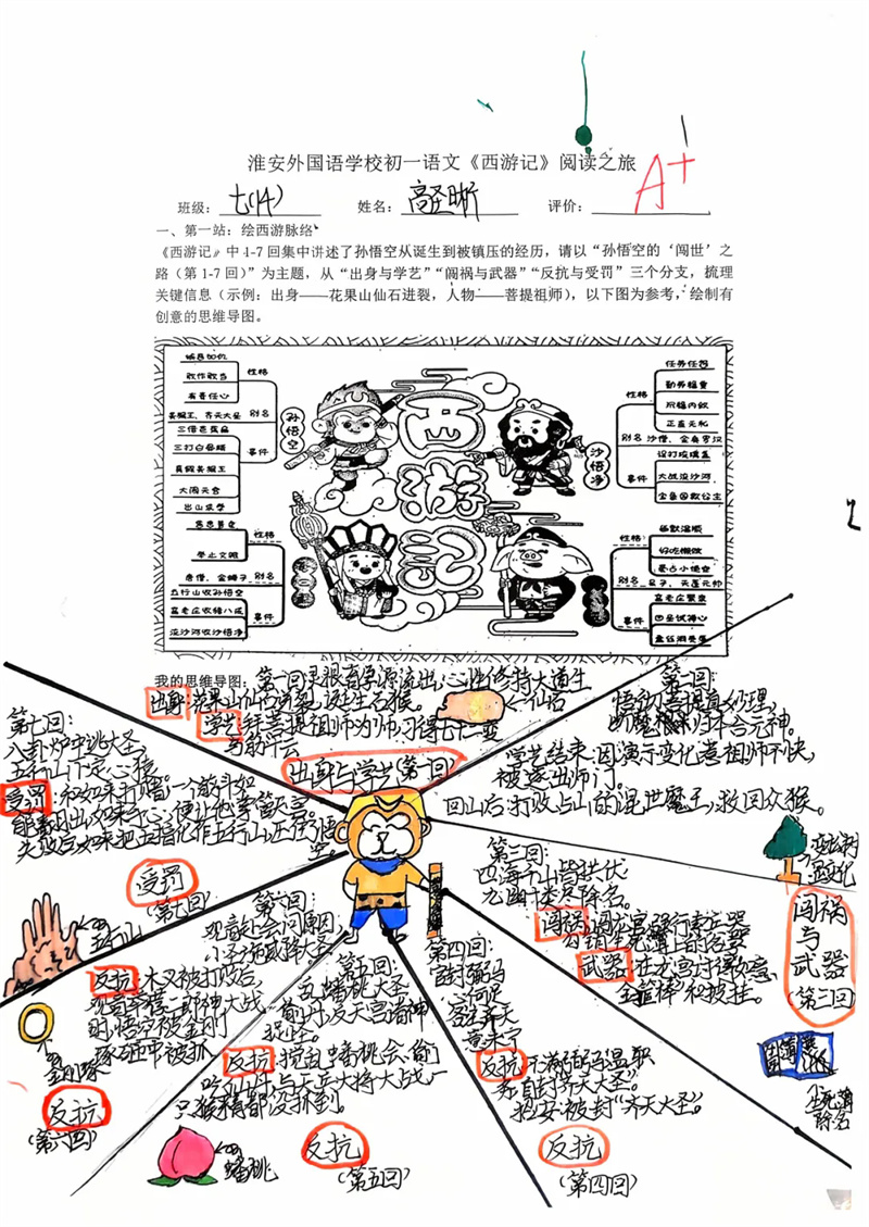 在刚刚结束的国庆假期,淮安外国语学校的同学们并未沉浸在题海之中,而是收获了一份充满弹性与创意的阅读实践作业。学校鼓励学生阅读《西游记》、《朝花夕拾》等经典读本,通过完成“思维导图”或传统“读书摘录”的方式,记录自己的阅读轨迹,展示独特的阅读思考。这一举措让阅读成果的展现形式更加多元化。