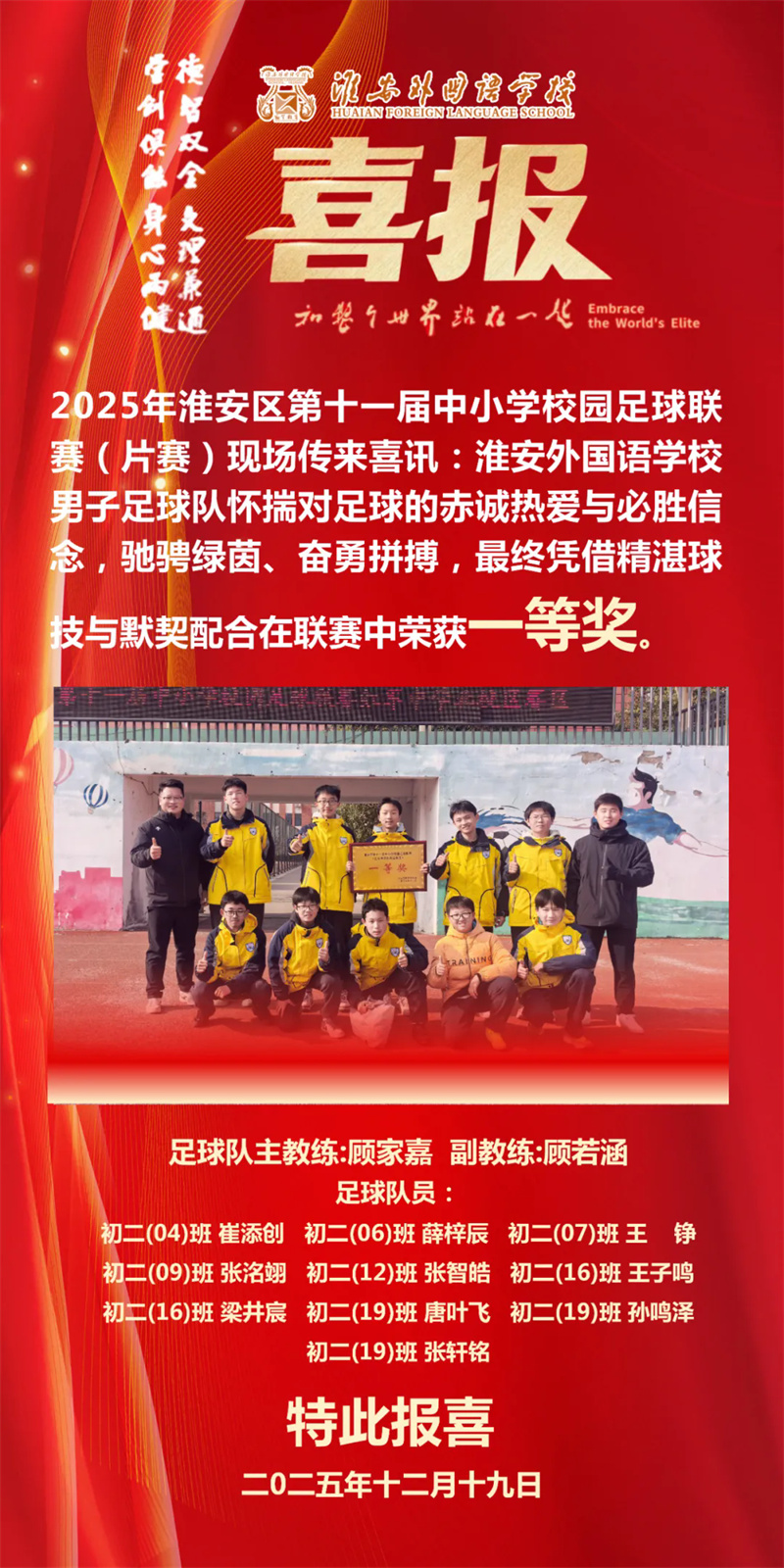 最终,淮安外国语学校男子足球队凭借稳定发挥与顽强斗志,成功斩获本次联赛一等奖。