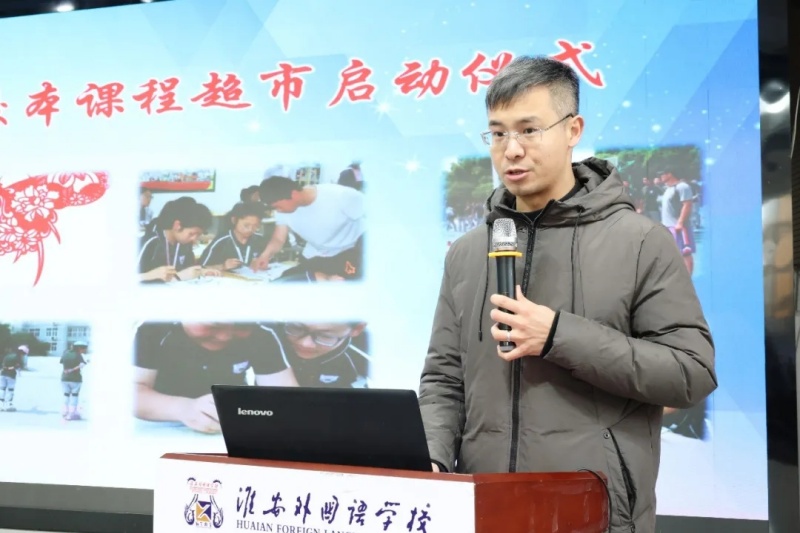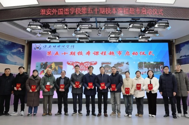 淮安外国语学校第50期校本课程超市启动仪式在学校阶梯教室举行。仪式由教学处副主任韩黎明主持,校长赵树青,副校长张明根等领导向外聘专家、校内选修课老师颁发聘书。