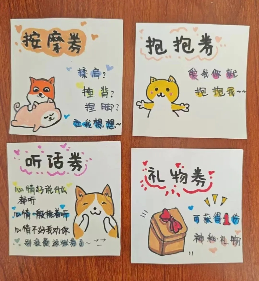 更有创意的是“兑换项目”——“认真听话一次”“不顶嘴券”“主动洗碗券”“陪妈妈散步一次”……这些平时不好意思说出口的“保证”,如今被郑重其事地画进卡片里,签上名字,再贴上小小的贴纸。班主任悄悄拍下几张,笑着说:“这些券要是真能兑现,家里得多和谐。”