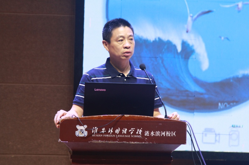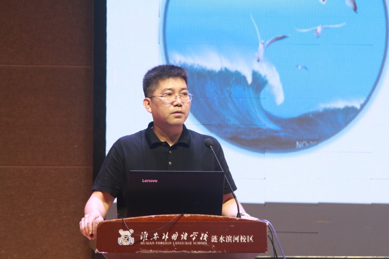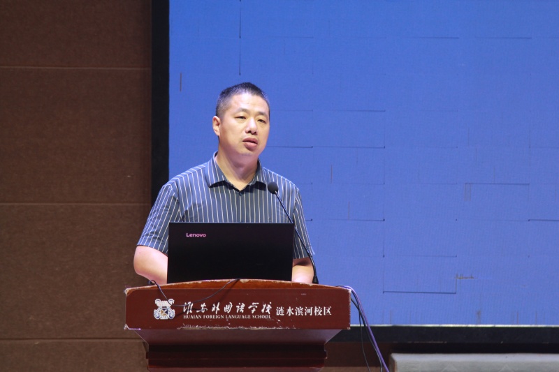 会上,涟水滨河外国语学校校长田学银以《让校园成为孩子幸福成长的乐园》为题与全体老师做交流。