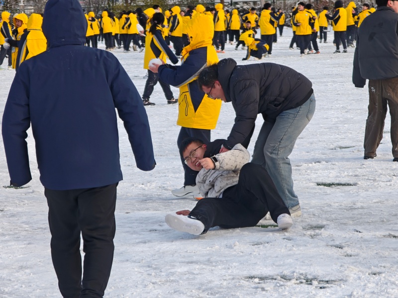 活动一开始,原本安静的操场瞬间沸腾。同学们按班级或自由组队,迅速进入“战斗状态”。有人就地取材,快速搓起雪球;有人巧妙设伏,利用雪堆掩护发起“突袭”;还有同学自发担任“后勤补给”,为队友源源不断输送“弹药”。笑声、欢呼声、加油声此起彼伏,连平日里略显严肃的教学楼也仿佛被这热烈气氛所感染,窗边不时探出观战的笑脸。不少老师也脱下外套,加入战局,师生同乐,其乐融融,场面温馨而热烈。