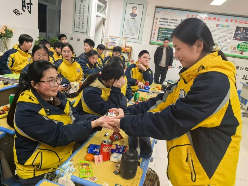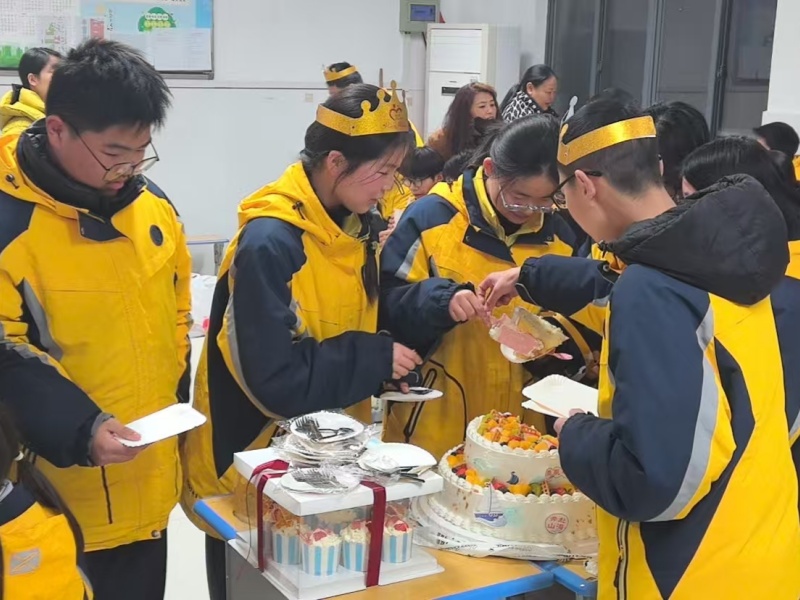 伴随着熟悉的旋律,班主任们推出点燃蜡烛的生日蛋糕走入教室,顷刻点燃全场热情。掌声、欢呼与祝福交织,冬夜因这份心意而格外明亮。