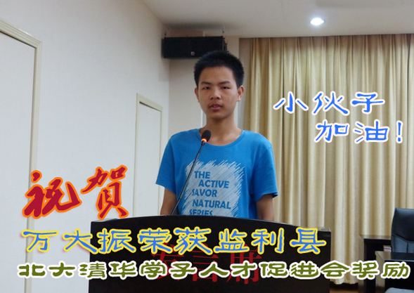 8月15日上午,由监利县政协主办的监利县北大、清华学子人才促进会2015年奖励大会在县政府三楼会议室隆重举行,翔宇监利中学以优秀的成绩为人才促进会呈交了一份满意的答卷,被清华大学录取的万大振同学在会上作了精彩发言,同时还获得奖励大会最高奖金8万元。
