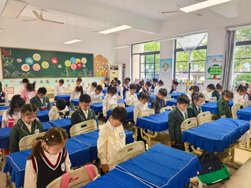 随着第一次警报声的响起,大家起立低头,双手自然垂于身侧,原本喧闹的校园瞬间陷入绝对的寂静,只有警报声在空气中持续回荡。3分钟的默哀时间里,空气仿佛凝固,每个人的神情都格外肃穆,脑海中回荡着历史的回响,心中涌动着对先烈的崇敬与对和平的珍视。