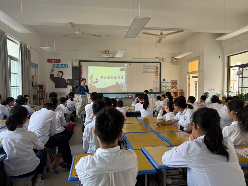 在“做文明的滨河娃”倡议环节,同学们分享了假期里的文明行为:排队乘车、垃圾分类、轻声说话、主动帮助他人……班主任带领大家讨论“如何把文明习惯带回校园”,同学们纷纷举手:“见到老师主动问好”“不追逐打闹”“节约粮食不挑食”。一句句承诺,一个个行动,彰显着滨河娃“从身边小事做起”的责任担当,让“大方懂礼”成为最美的校园名片。
