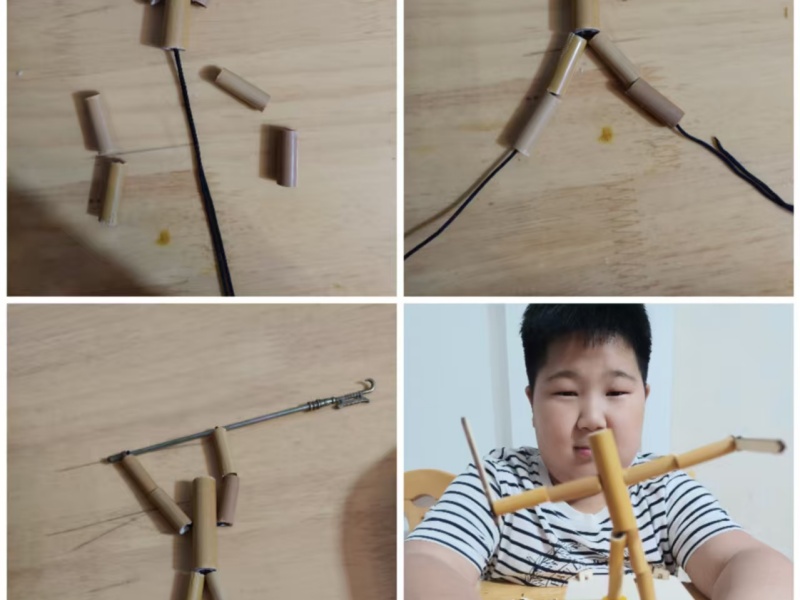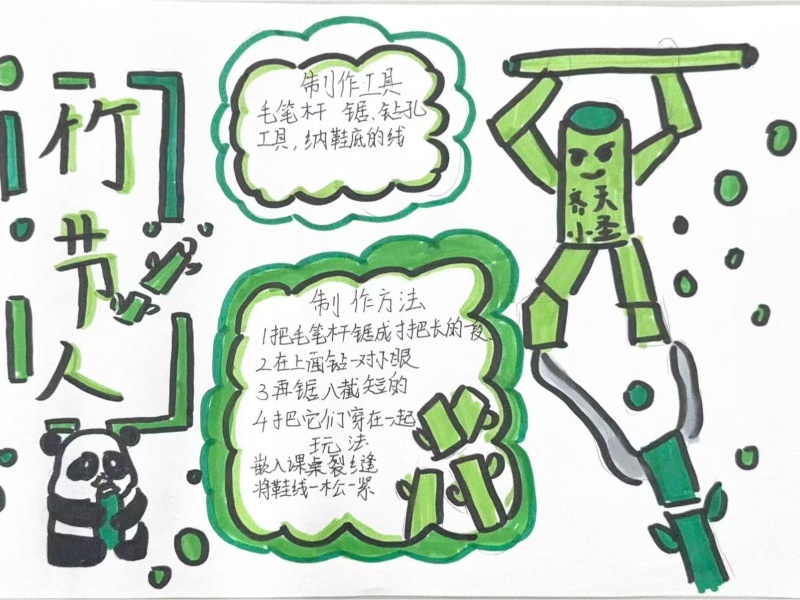 根据制作指南,同学们利用闲余时间,亲手制作竹节人。这些竹节人各具特色:有的高大威猛,有的小巧玲珑,有的气宇轩昂……同学们精心挑选材料,为竹节人制作独特的装饰,一个个栩栩如生的竹节人在同学们的巧手下诞生。