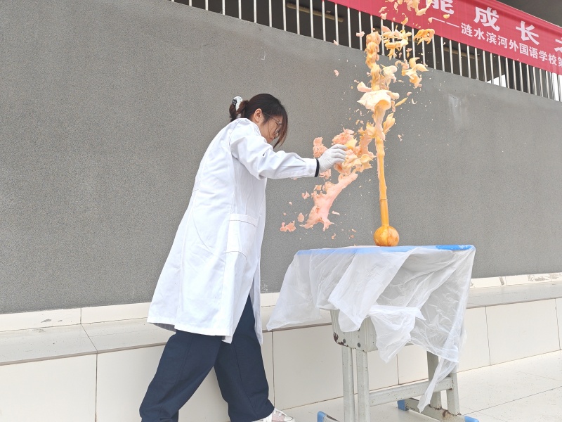 随着全场师生共同倒计时,大象牙膏实验将现场氛围推向顶峰。彩色泡沫剧烈喷涌,宛如一座爆发的彩色火山,全场瞬间沸腾。王一茗同学用通俗的语言解释原理,让大家明白这是“氧气泡泡的盛大狂欢”,化学的强大爆发力深深震撼了在场每一个人。