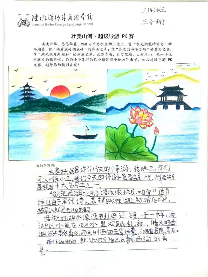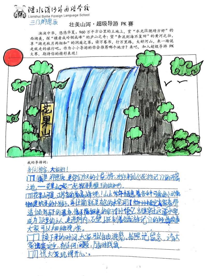 同学们充分发挥自己的想象力和创造力,绘就了一幅幅壮丽的山河画卷,写下了一段段真挚的文字。有的聚焦黄山奇松怪石,用彩笔勾勒出云雾缭绕的山峦;有的以长江为主题,绘出江水奔腾的壮阔景象;还有的描绘桂林山水,将“山青、水秀、洞奇”的特点融入简笔画。