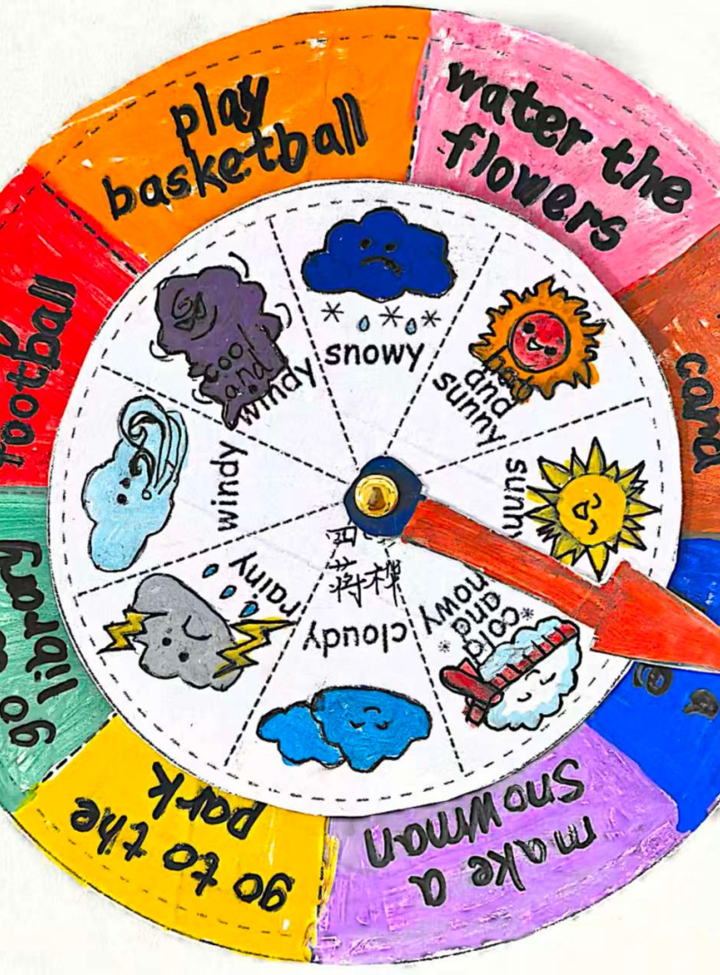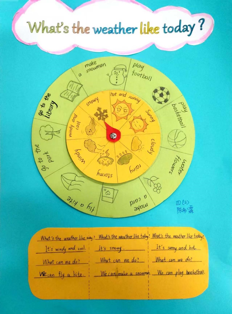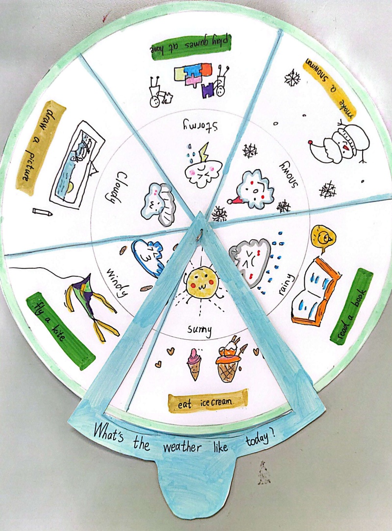有的制作了“天气转盘”,将sunny、cloudy、snowy等天气单词与对应的手绘图案、趣味活动一一匹配,转动指针就能练习“What’s the weather like?”的英语表达,兼具实用性与互动性。还有的作品融入“好天气”“坏天气”分类板块,用卡片、折叠页等立体形式,把天气相关的英语知识梳理得清晰又有趣。
