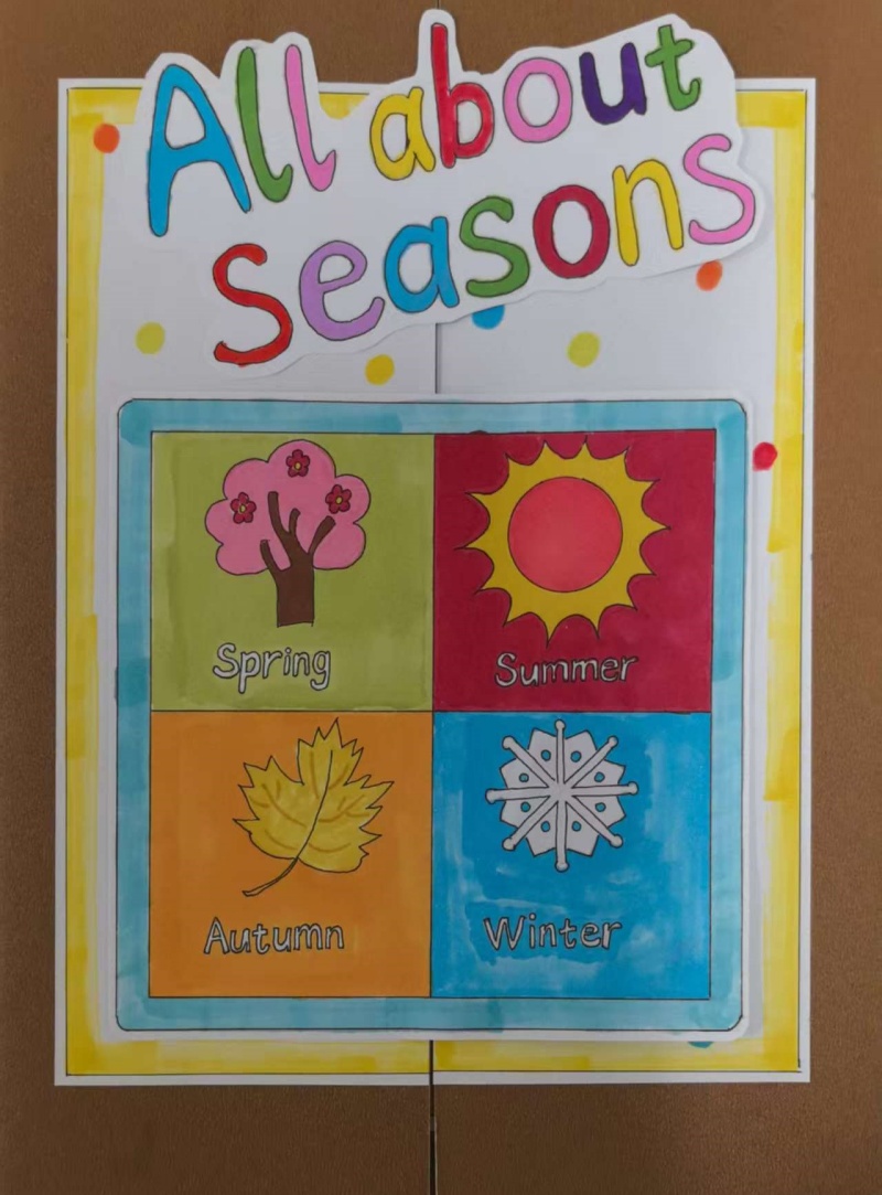 在此次作业创作中,孩子们化身“小小设计师”。有的以四季为脉络制作立体翻翻书,用彩笔绘出春日飞燕、夏日海滩、秋日丰收、冬日雪人等场景,还搭配英文短句描述季节特征,图文并茂的设计让四季变化跃然纸上。