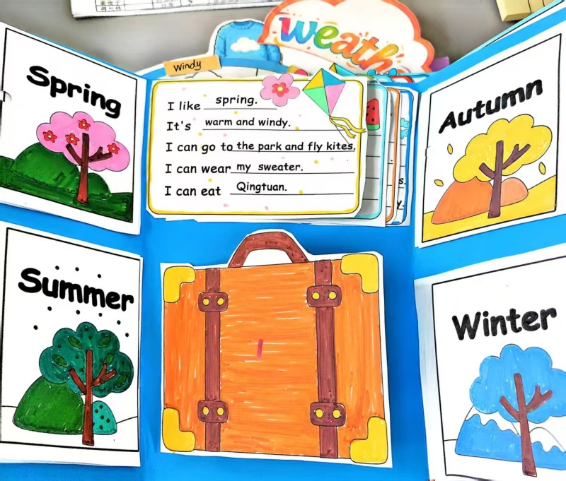 让英语学习跳出课本、变得生动有趣。近日,滨河淮外小学部四英组开展了天气与季节主题创意英语作业设计活动。学生们发挥奇思妙想,用立体翻翻书、手工转盘等形式,将枯燥的英语单词和句型转化为充满童趣的创意作品,让英语学习变成一场动手又动脑的趣味探索。