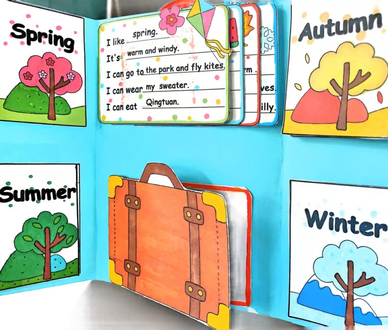 在此次作业创作中,孩子们化身“小小设计师”。有的以四季为脉络制作立体翻翻书,用彩笔绘出春日飞燕、夏日海滩、秋日丰收、冬日雪人等场景,还搭配英文短句描述季节特征,图文并茂的设计让四季变化跃然纸上。