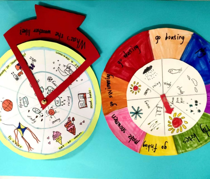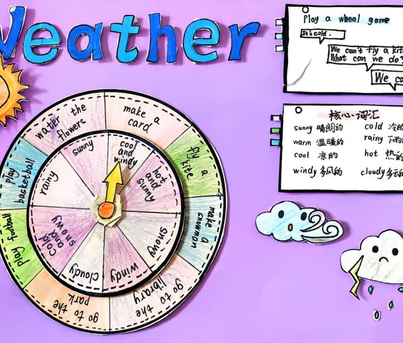 有的制作了“天气转盘”,将sunny、cloudy、snowy等天气单词与对应的手绘图案、趣味活动一一匹配,转动指针就能练习“What’s the weather like?”的英语表达,兼具实用性与互动性。还有的作品融入“好天气”“坏天气”分类板块,用卡片、折叠页等立体形式,把天气相关的英语知识梳理得清晰又有趣。