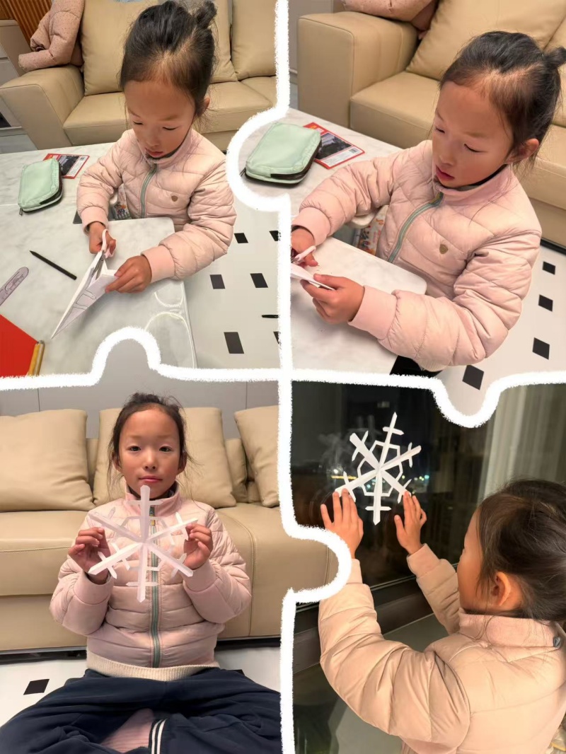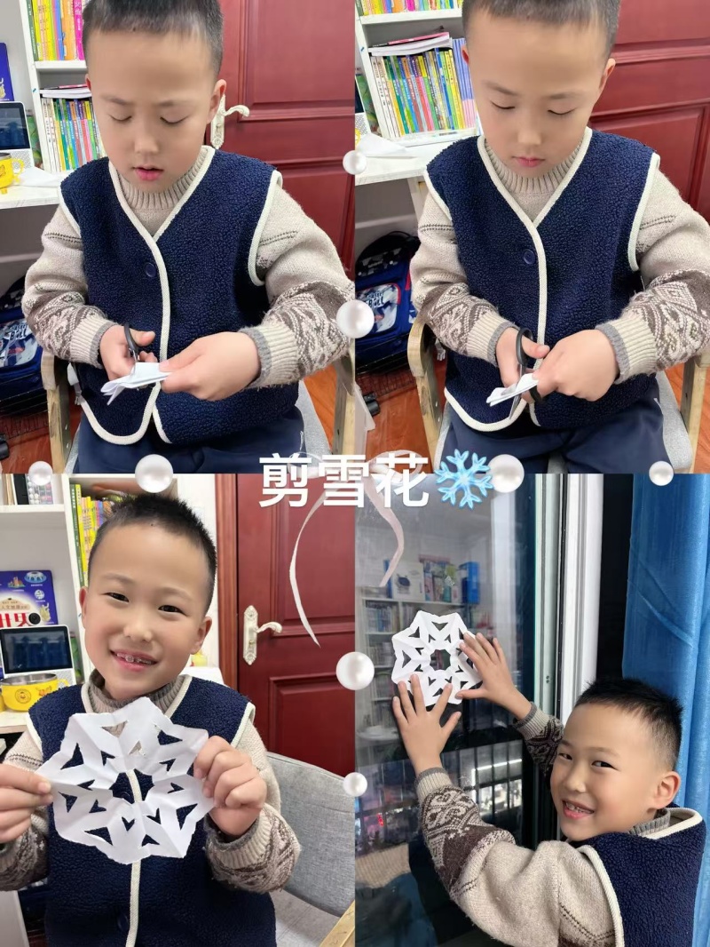 孩子们运用巧手剪出一片片精美的雪花剪纸,晶莹剔透的图案在纸上生动呈现,宛如真实的雪花飘落定格。这项活动既培养了他们的耐心与专注力,也让其在传统手工艺中感受到浓厚的艺术气息与节日氛围。孩子们在活动中不仅触摸到传统文化的温度,更在劳动与观察中培养耐心与美感。