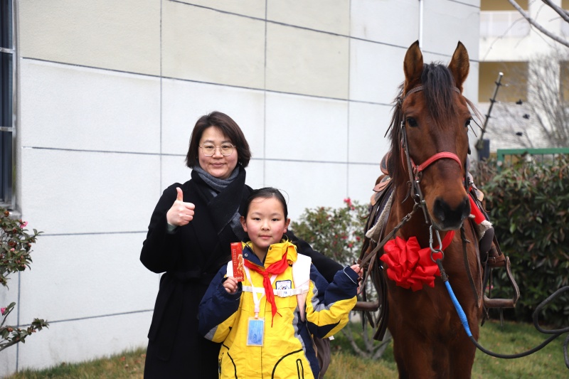 校门两侧,两匹昂首挺立的大马成为开学日最吸睛的风景。它们以昂扬之姿迎接每一位归来的学子,寓意着新学期的勃勃生机与奋进精神,成为开学日最特别的“伙伴”。立体欢迎牌醒目亮眼,萌马元素点缀其间,传递着“一马当先”的美好祝愿,将打卡留影区装点得格外温馨。孩子们簇拥在骏马周围,或轻抚马鬃,或比出胜利的手势,镜头定格下一张张惊喜的笑脸。