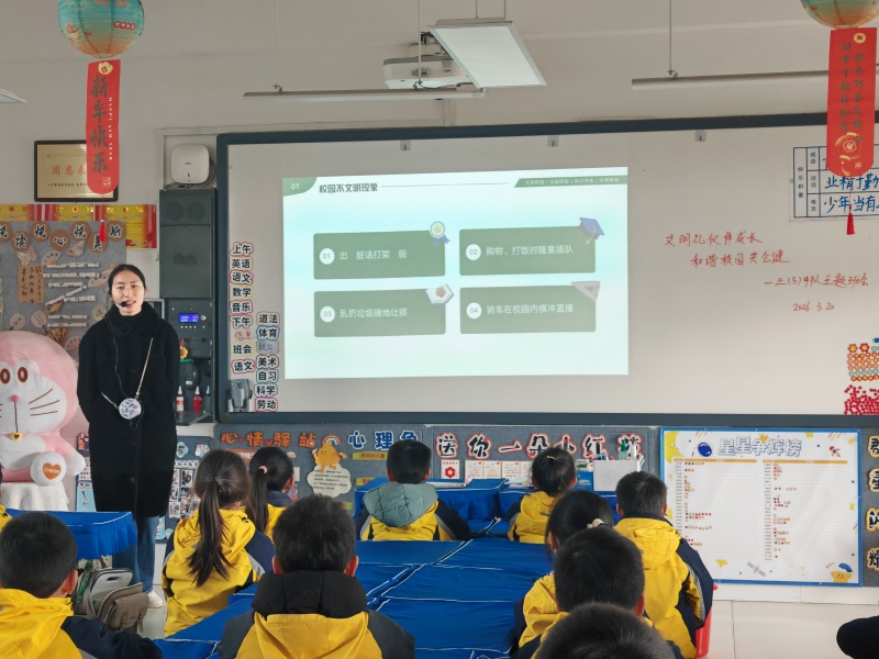 班会一开始,老师和同学们一起细数了校园里那些不文明的小现象:出口说脏话、随意扔垃圾、打饭爱插队、上课不守纪律、对师长同学不礼貌……孩子们纷纷举手发言,立下约定——坚决和不文明行为说“不”,争做守护校园的文明小卫士!